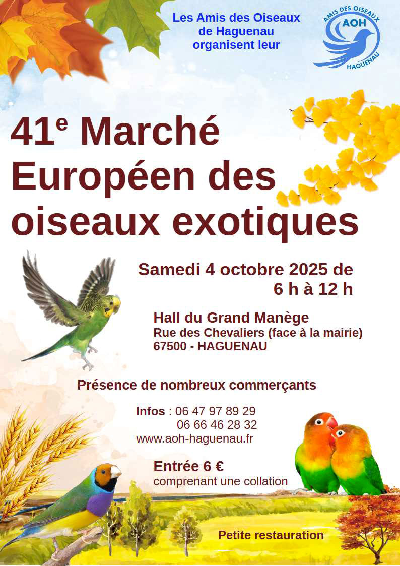 Samedi 4 octobre 2025 (de 6h à midi) : 41e marché européen d’oiseaux exotiques organisé par l’association des Amis des Oiseaux de Haguenau (AOH), Hall du Grand Manège, à Haguenau.