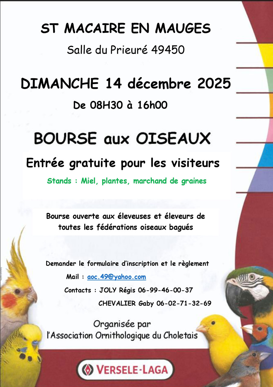 L’Association Ornithologique du Choletais organise une grande bourse aux oiseaux à Saint Macaire en Mauges le dimanche 14 décembre 2025.