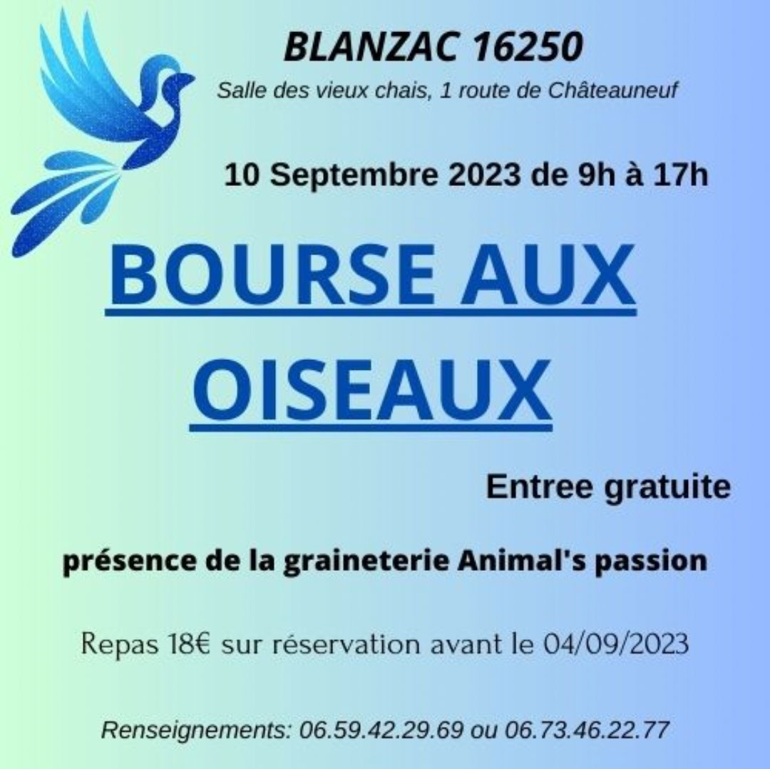 Dimanche 10 septembre la Société Ornithologique de l’Angoumois organise une bourse à Blanzac-Porcheresse.