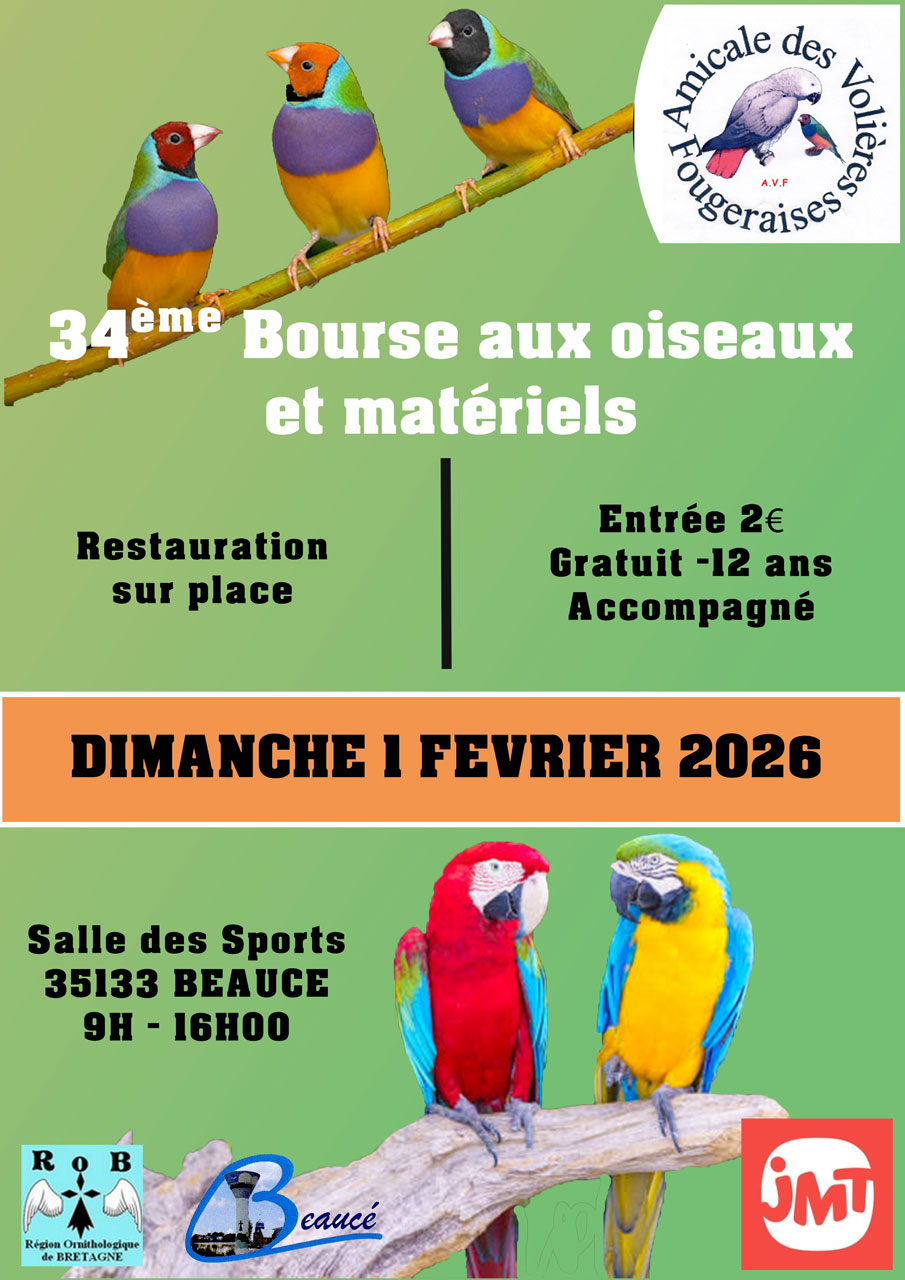 L’Amicale des Volières Fougeraises organise une bourse et exposition aux oiseaux exotiques et de matériel le dimanche 1er février 2026 à Beaucé (près de Fougères).