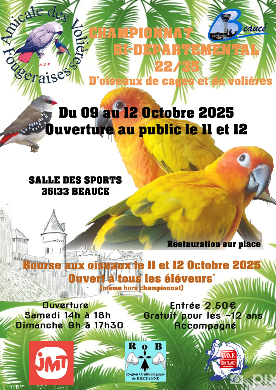 L’amicale des volières fougeraises organise dans la salle des sports de Beaucé (35) du 9 au 12 octobre 2025 le championnat bi-départemental (22 et 35) d’oiseaux de cages et de volières.