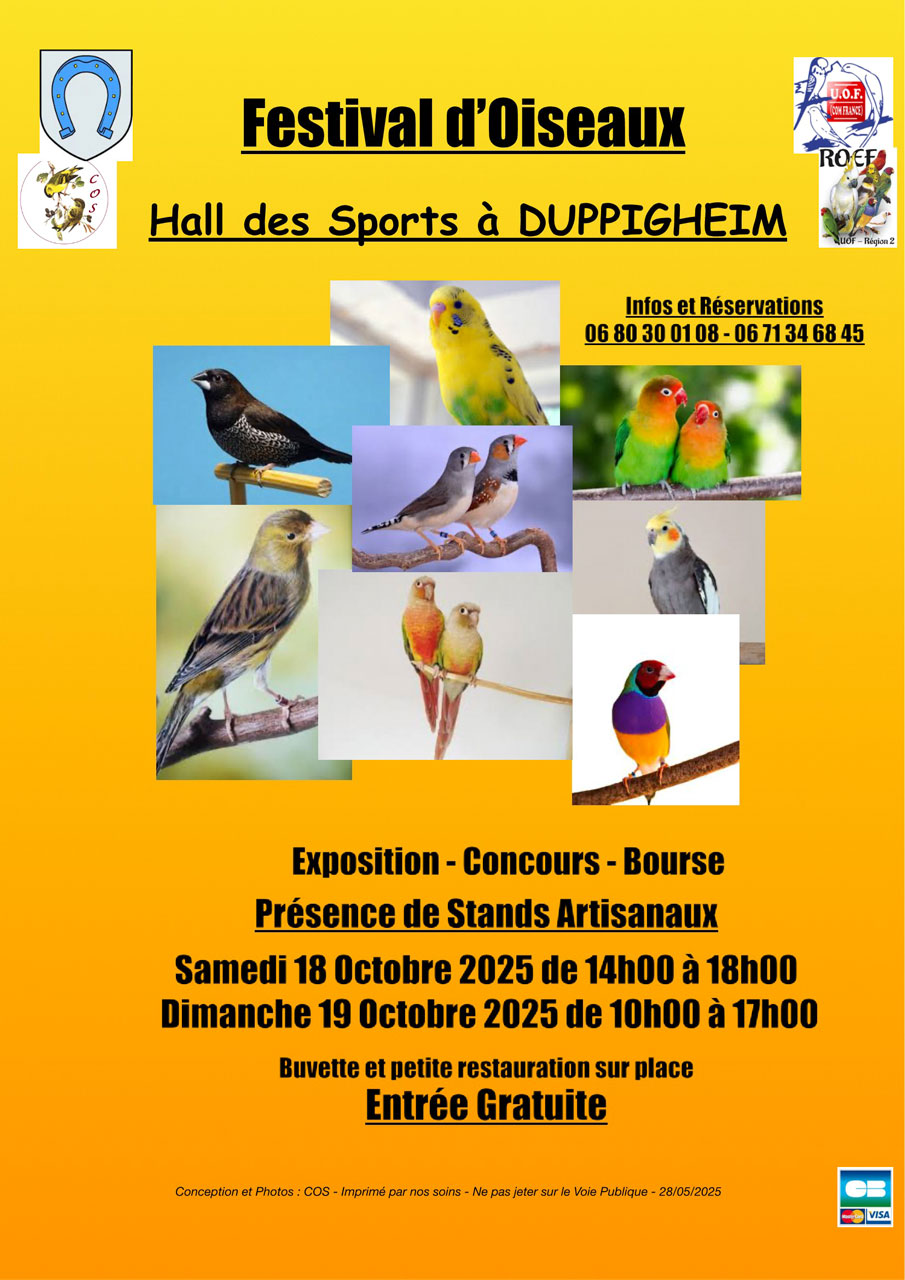 Le Cercle de l’Oiseau organise son concours annuel, ouvert à tous, à Duppigheim les 18 et 19 octobre 2025, Hall des sports et Loisirs.