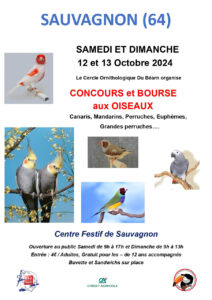 Le Cercle Ornithologique Du Béarn organise un concours – expo – bourse aux oiseaux à Sauvagnon les 12 et 13 octobre 2024.